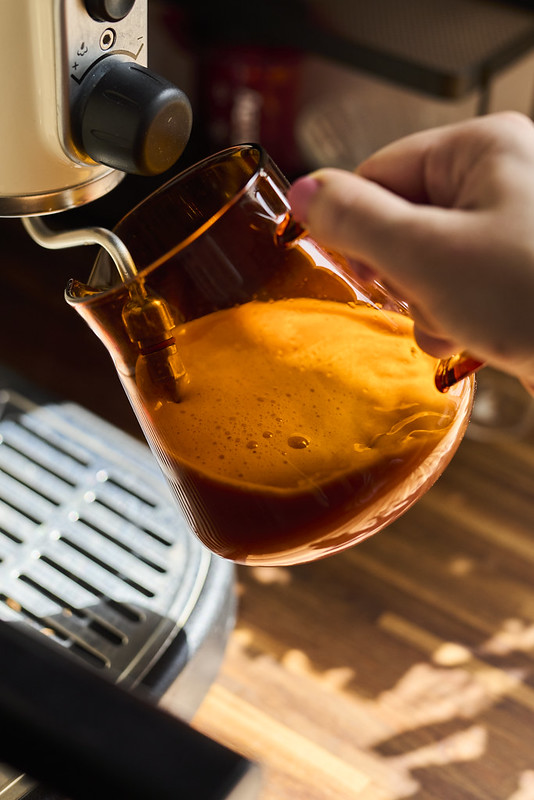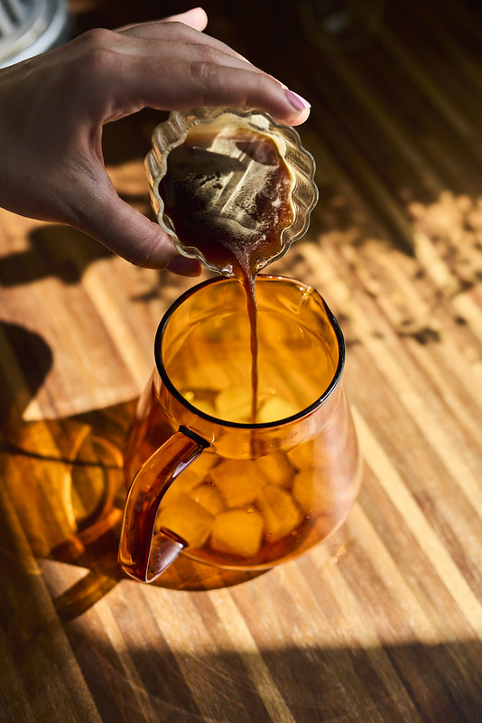 Do dzbanka wlej espresso i dodaj kilka kostek lodu (około 5-6, w zależności od ich wielkości) oraz zimną, filtrowaną wodę. Ilość wody jest kwestią preferencji – zacznij od około 80 ml i dostosuj do swojego smaku.