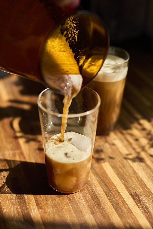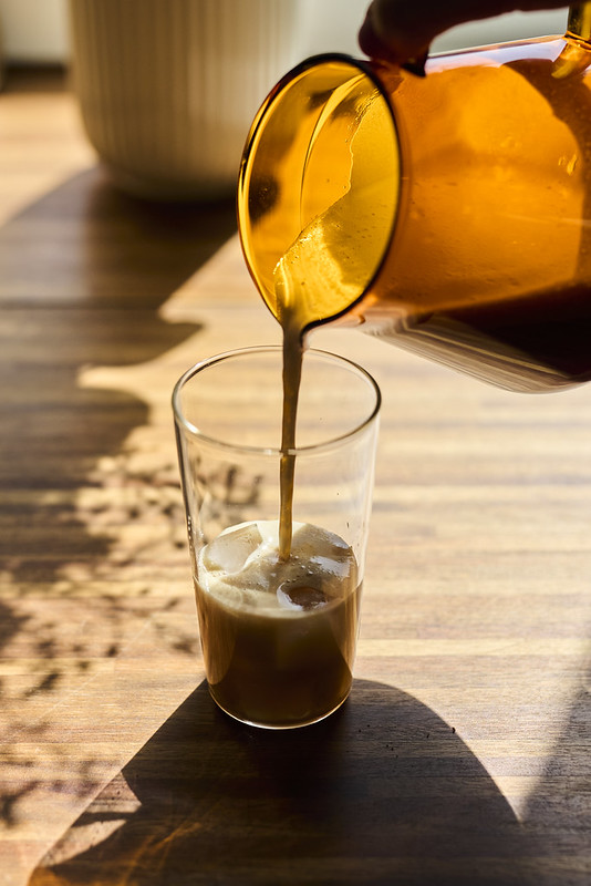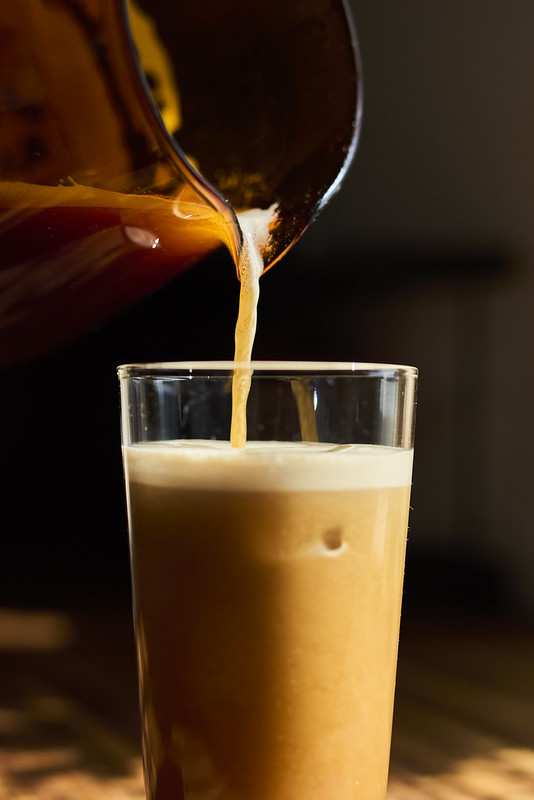 Wypełnij wysoką szklankę dodatkowymi kostkami lodu (opcjonalnie). Przelej spienioną kawę do szklanki.