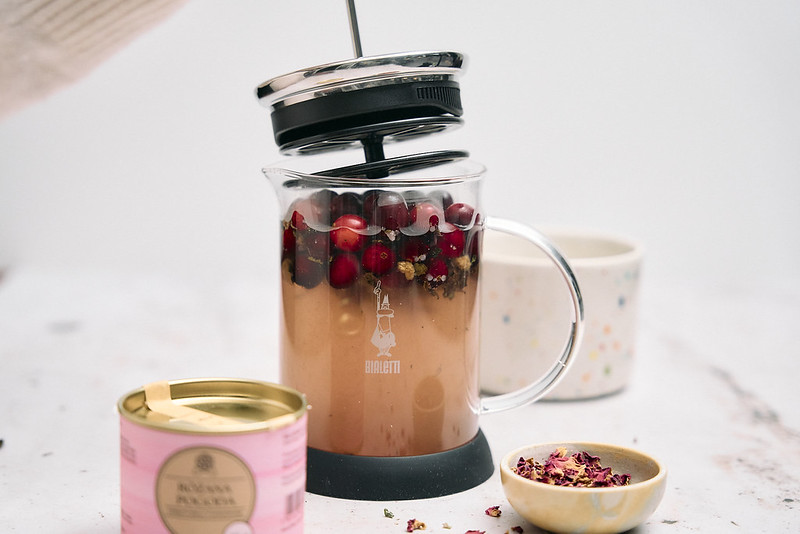 Herbata z płatkami róż, konfiturą, sokiem z cytryny i cierpką żurawiną tworzy napój, który jest nie tylko rozgrzewający, ale i niezwykle kojący dla zmysłów. Słodycz róży przełamana orzeźwiającą kwasowością i owocową głębią żurawiny, idealne smaki na ten czas.