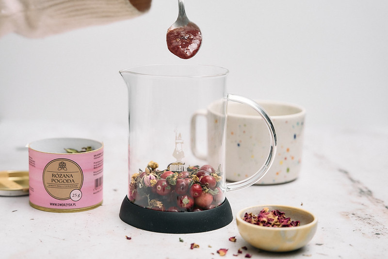 Zagotuj świeżą wodę. Poczekaj chwilę, aż ostygnie do temperatury ok. 80°C. Do czajniczka lub dużego zaparzacza wsyp herbatę liściastą, dodaj konfiturę różaną oraz świeżą żurawinę. Zalej całość gorącą wodą i parz przez 3-4 minuty.