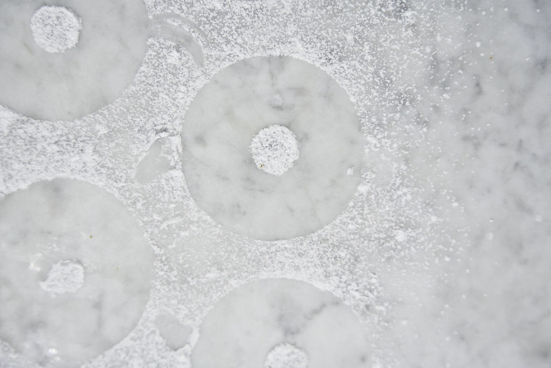 - Po tym czasie wyjmujemy kawałek ciasta i rozwałkowujemy go między dwoma płatami papieru do pieczenia, na grubość ok. 3 mm. Rozwałkowane ciasto wkładamy na 10-15 minut do lodówki/zamrażalnika. Następnie wykrawamy ciasteczka w formie koła – musimy osiągnąć parzystą ilość, żeby jedna z części była cała, a druga z wyciętym po środku mniejszym kołem. Ciasteczka z matchą przed pieczeniem przechowujemy w zamrażalniku lub lodówce.