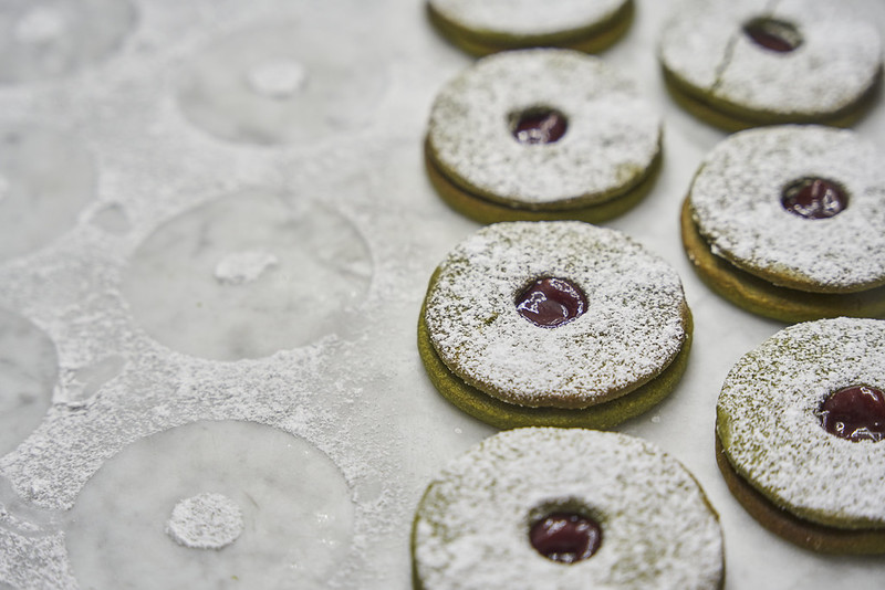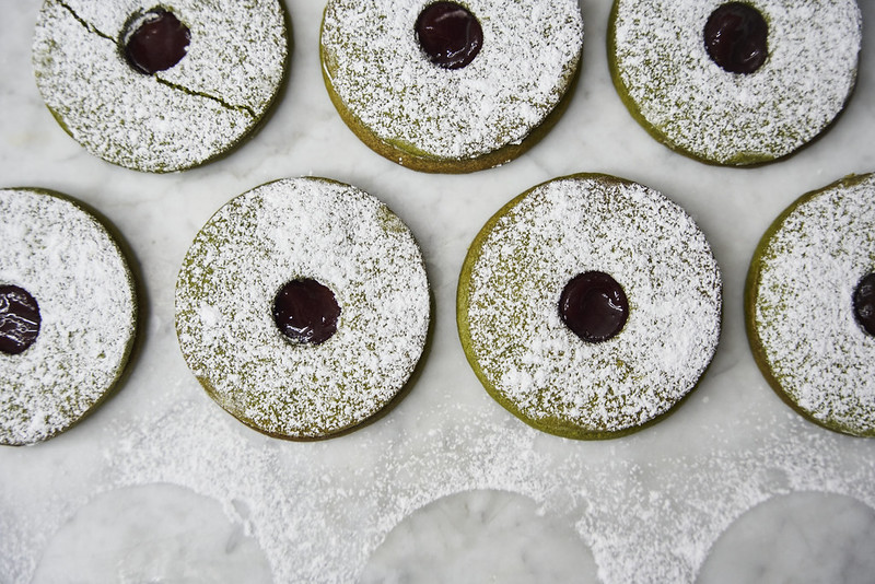 - Po wystudzeniu ciasteczka z otworem posypujemy cukrem pudrem. Na całe nakładamy łyżeczkę ulubionej konfitury i zamykamy je ciasteczkiem z matchą posypanym cukrem pudrem.