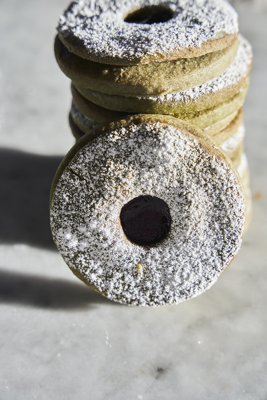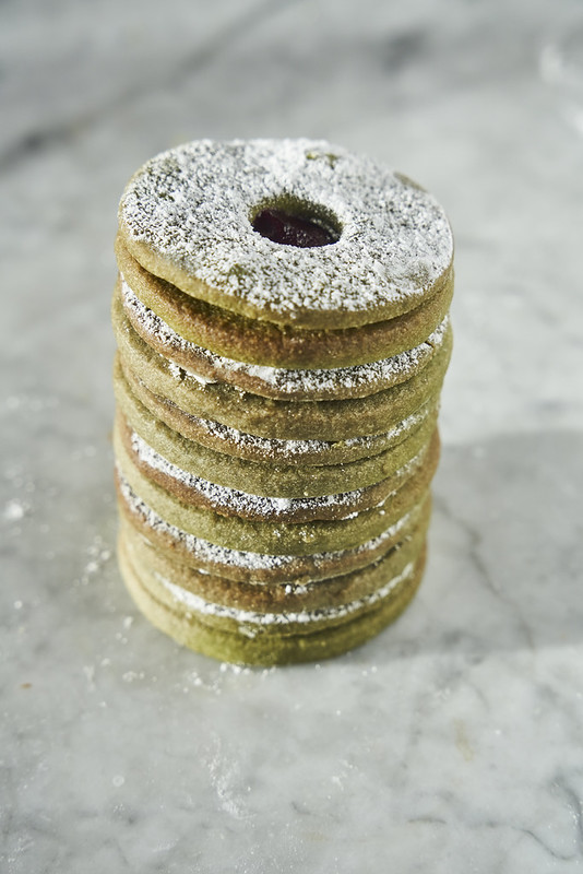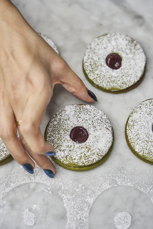 - Po wystudzeniu ciasteczka z otworem posypujemy cukrem pudrem. Na całe nakładamy łyżeczkę ulubionej konfitury i zamykamy je ciasteczkiem z matchą posypanym cukrem pudrem.