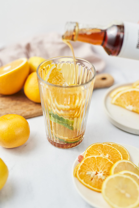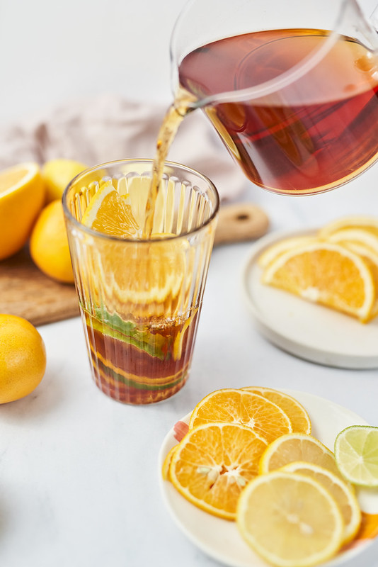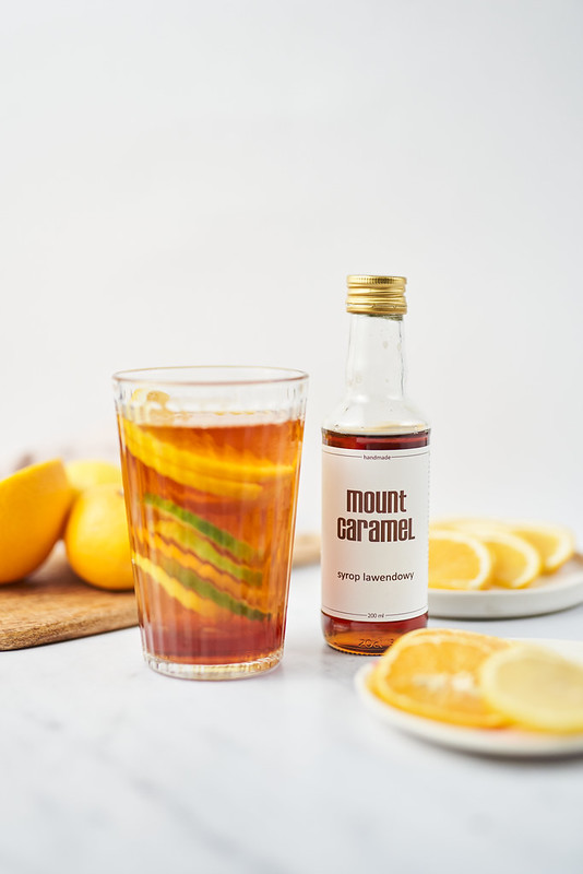 Herbatę zalewamy wodą o temperaturze 100 stopni i parzymy przez 4 minuty. Do wysokiego kubka wrzucamy plasterki cytrusów i wlewamy 10 ml syropu lawendowego na porcję. Całość zalewamy zaparzoną herbatą, mieszamy.