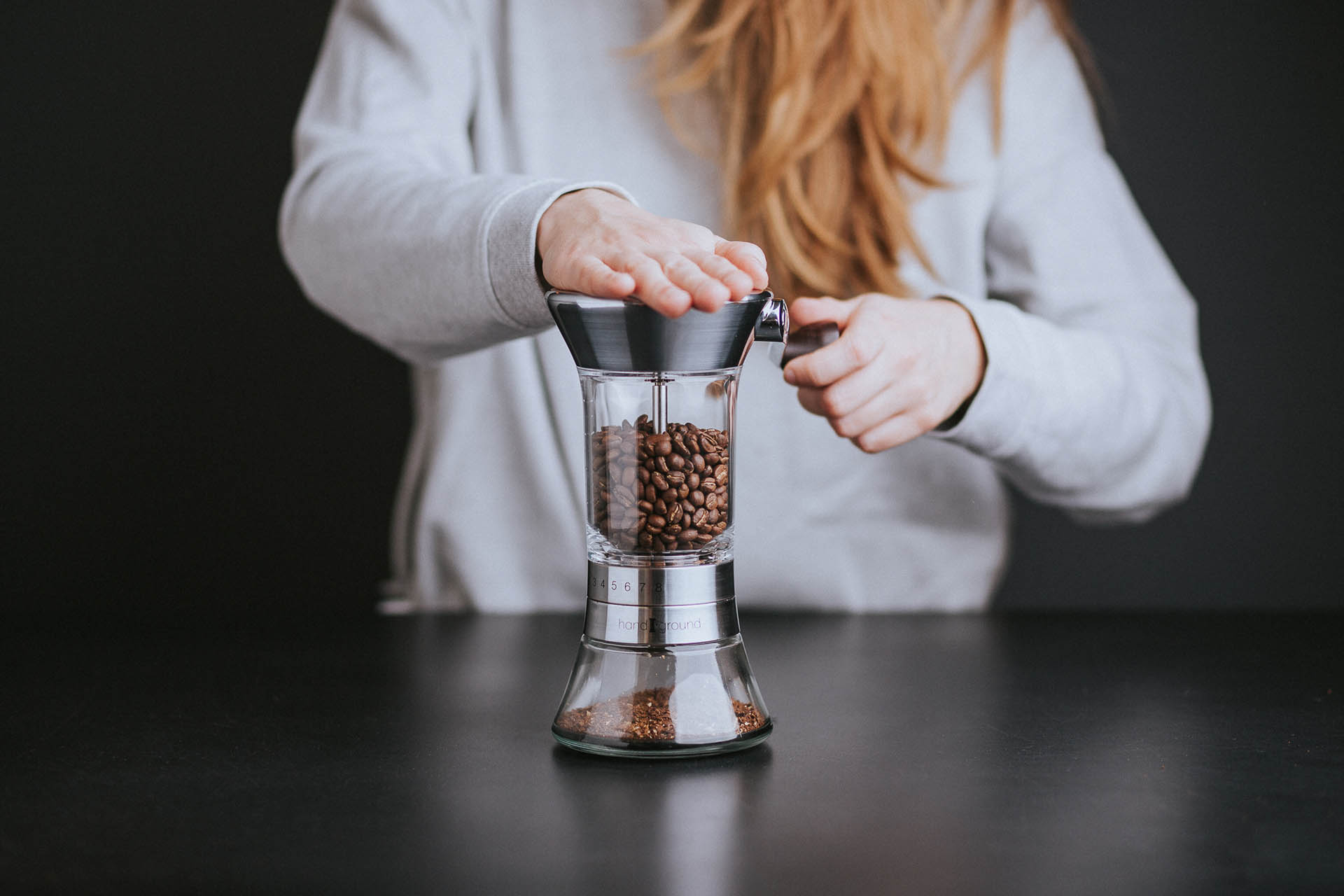 Górny pojemnik zmieści aż 100g ziaren. A do czego możemy przeznaczyć zmieloną w Handgroundzie kawę? Według zapowiedzi producentów, Handground oferuje odpowiednie zmielenie od espresso do chemeksa, czyli od bardzo drobnego do całkiem grubego. Skala oznaczona jest cyframi 1 – 8, ale pomiędzy poszczególnymi punktami można ustawić młynek, stąd liczba stopni zmielenia sięga kilkunastu. Z powodzeniem wystarcza na przeważającą ilość metod parzenia.