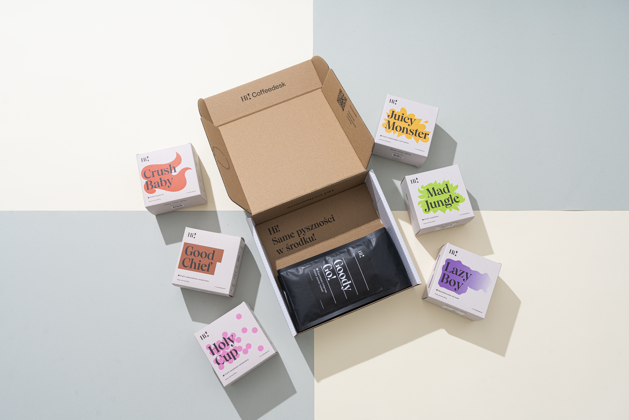 Do prostej nazwy marki dołączyliśmy bogactwo smaków poszczególnych ziaren. Powstało osiem profili smakowych, dla których zaprojektowaliśmy rozbudowany świat wizualny. Hi!Coffeedesk miało być przede wszystkim fajne, przyjazne, czasami zaczepne i przewrotne – ale nigdy nudne. Stąd pomysł na nazwy i formę opakowań, które opowiadają o swoim świecie. Każda z nazw poszczególnych profili stała się symbolem niebanalnych, złożonych walorów smakowych kaw. Znajdziemy tutaj zatem słowa ostrzejsze, mocniejsze, przewrotne, ale i te spokojniejsze, bardziej eleganckie.