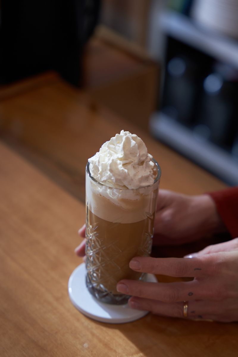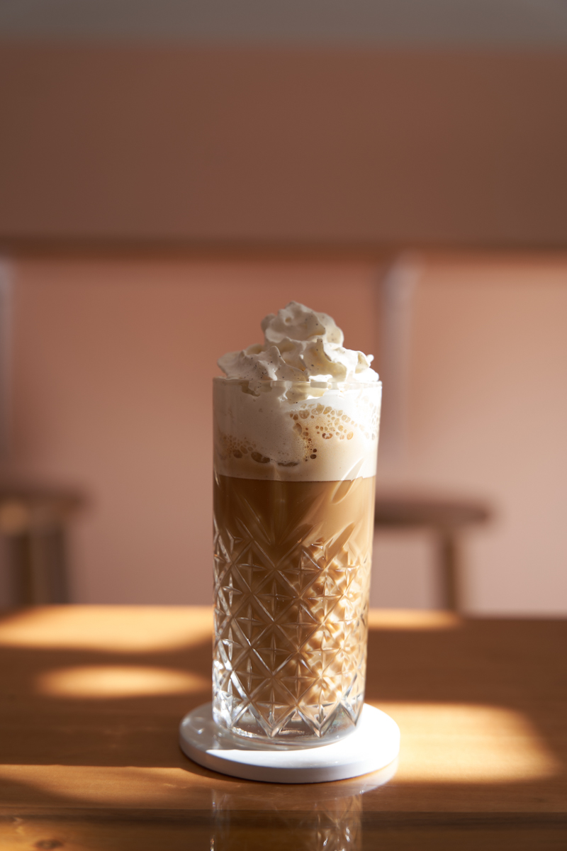 Do wysokiej odpornej na ciepło szklanki wlej 15 g syropu, 30 g podwójnego espresso (lub kawy z kawiarki) oraz spienione mleko (roślinne lub krowie). Udekoruj bitą śmietaną i delektuj się kawowym deserem.