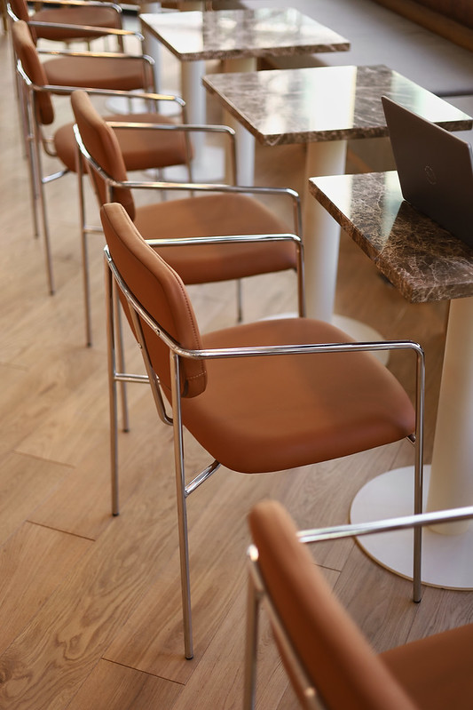 Wnętrze kawiarni z dbałością o najmniejsze detale i mając na uwadze nie tylko funkcjonalność, ale też charakterystyczną dla coffeedeskowych kawiarni przytulność, zaprojektowała Paulina Gardzielik, odpowiedzialna także za design pozostałych pięciu lokali. To przestrzeń jasna, przejrzysta, pełna naturalnych materiałów, takich jak kamień, drewno, skóra i miękkie tekstylia. Meble zostały dobrane w duchu modernistycznym – przeważają proste, funkcjonalne formy i ciepła kolorystyka, w której dominują beże, brązy i biel. Subtelne oświetlenie i duże przeszklenia potęgują wrażenie otwartości, dzięki czemu nowy Coffeedesk to idealne miejsce zarówno do pracy, jak i na towarzyskie spotkania.