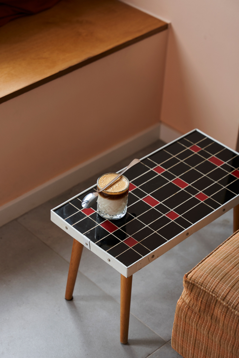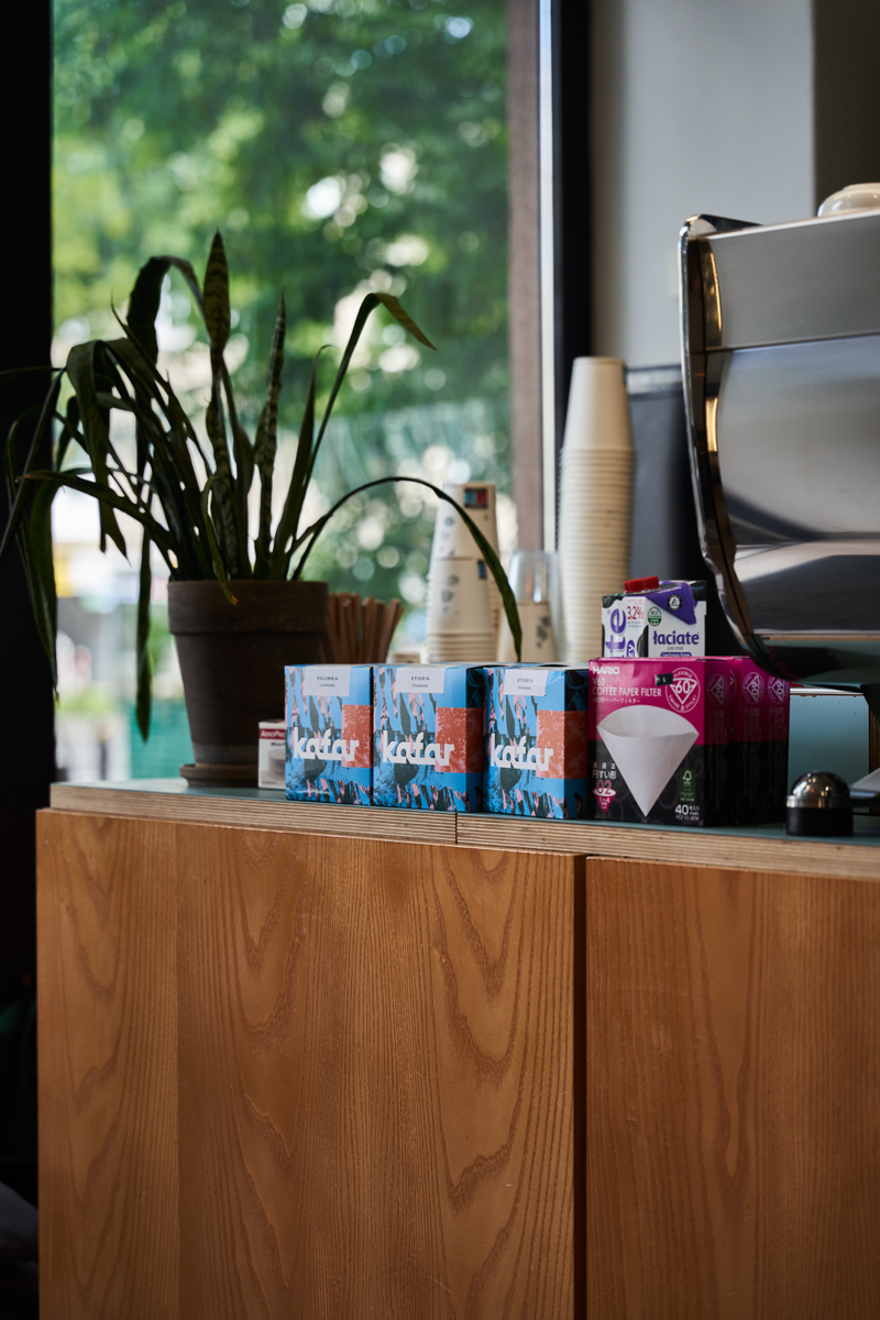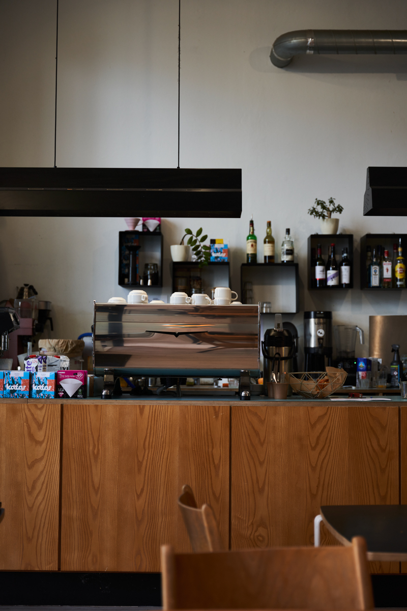 Skoro już jesteśmy przy kolorach, to na dużą uwagę zasługuje tu sam design. Nurt minimalizmu, który nareszcie nie objawia się wszechobecną bielą i drewnem. Tu wita nas charakterystyczny ciemny bar, kolorowy Moccamaster, pasująca do całej układanki ceramika i taka ilość stolików, że mimo niedużej przestrzeni można czuć się swobodnie.
