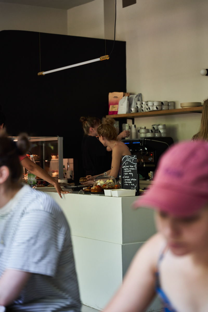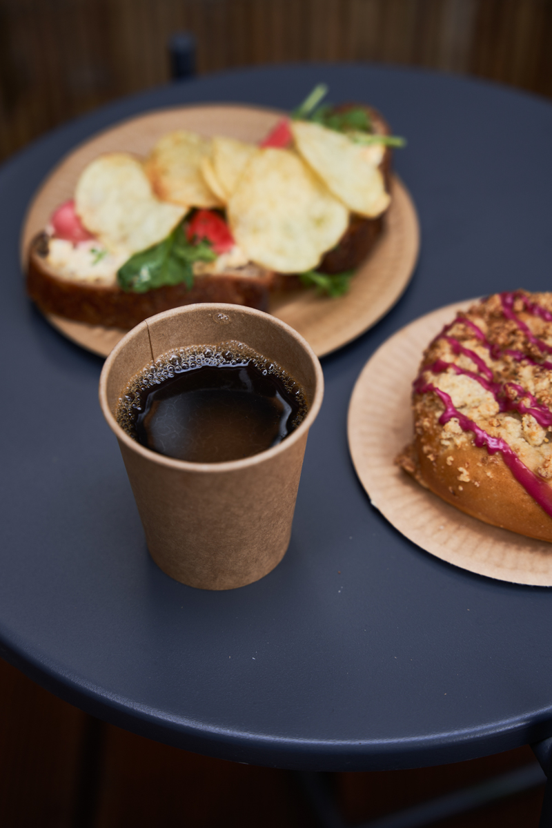 Mimo tego, że większość skupienia właścicielek idzie jednak w kierunku wypieków, to nie zapominają one o dbaniu o kawę. Choć w menu znajdziemy głównie flat white, espresso, latte oraz mały i średni przelew (czekamy na duży!), to latte na pewno będzie miało na sobie wzorek, a przelew idealne dopełni smak podwójnie zapiekanego croissanta z jeżynami. Jedyne, do czego możemy się delikatnie przyczepić, to brak ceramiki. Na nią czekamy jeszcze bardziej niż na duży przelew! Jednak co kawa w filiżance, to kawa w filiżance.