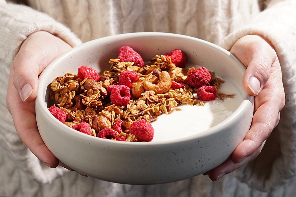 Jak dobrze wstać skoro świt, kiedy czeka na nas pyszne, chrupiące, zdrowe śniadanie wzbogacone aromatem kawy. Dlatego kontynuując temat kawowych śniadań przygotowaliśmy dla Was przepis na naturalnie słodką, kawową granolę z orzechami, przełamaną smakiem lekko kwaskowych, liofilizowanych malin. Odżywcza, domowa granola z jogurtem, mlekiem lub napojem roślinnym pozwoli Wam z dobrą energią zacząć nowy dzień. Koniecznie sprawdźcie nasz przepis!
