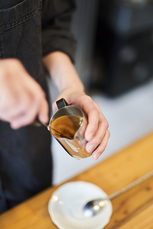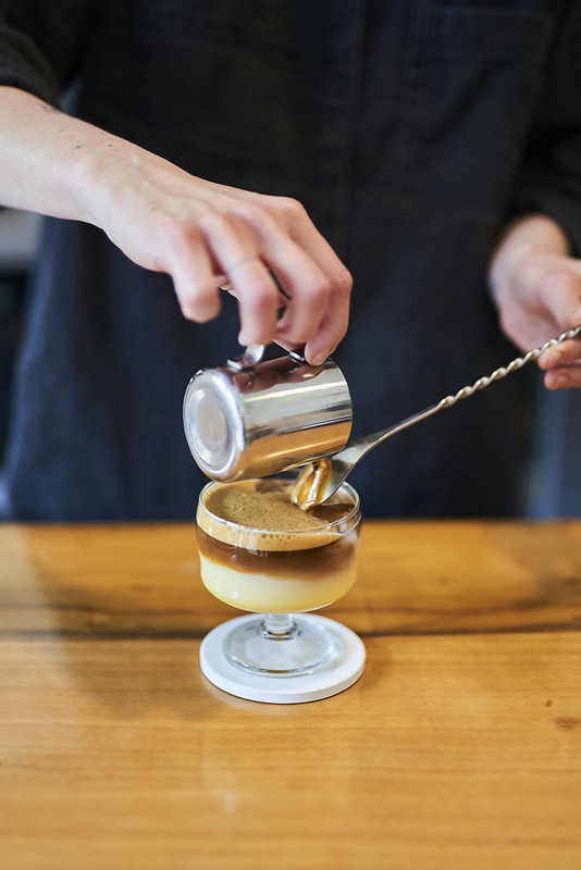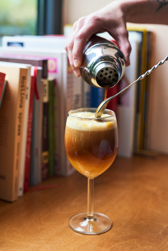 Do kieliszka wrzuć kostki lodu i wlej sok, a następnie powolutku dodaj napój ryżowo-kokosowy (jest bardziej orzeźwiający niż sam kokos, dzięki czemu całość wspaniałe zgrywa się pod względem konsystencji i intensywności). Podwójne espresso schłodź jedną kostką lodu i spień ręcznym spieniaczem – nada kawie puszystą konsystencję i wykończy drinka pianką. Jeśli nie masz spieniacza, zapraszamy do tego artykułu po domowe sposoby na spienianie mleka.