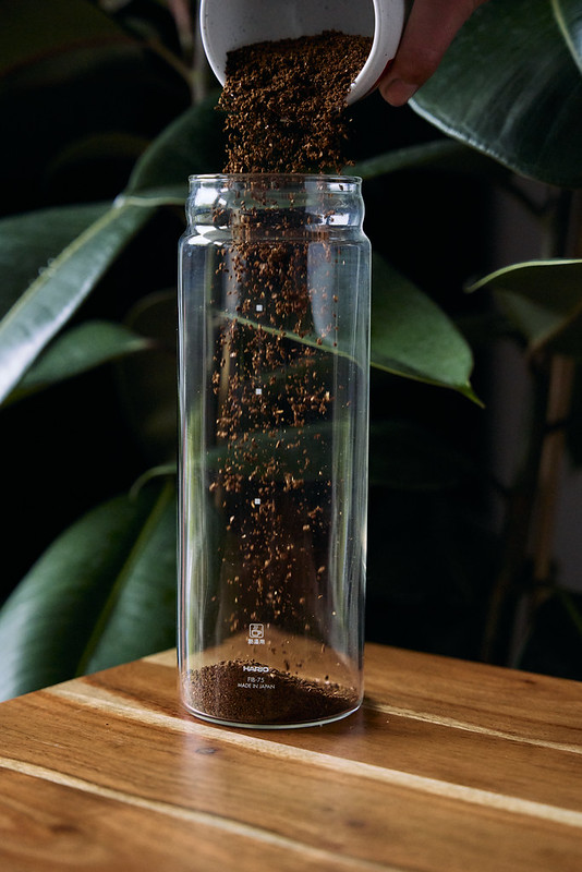 - W butelce do cold brew (lub w słoiku) umieść zmieloną kawę.