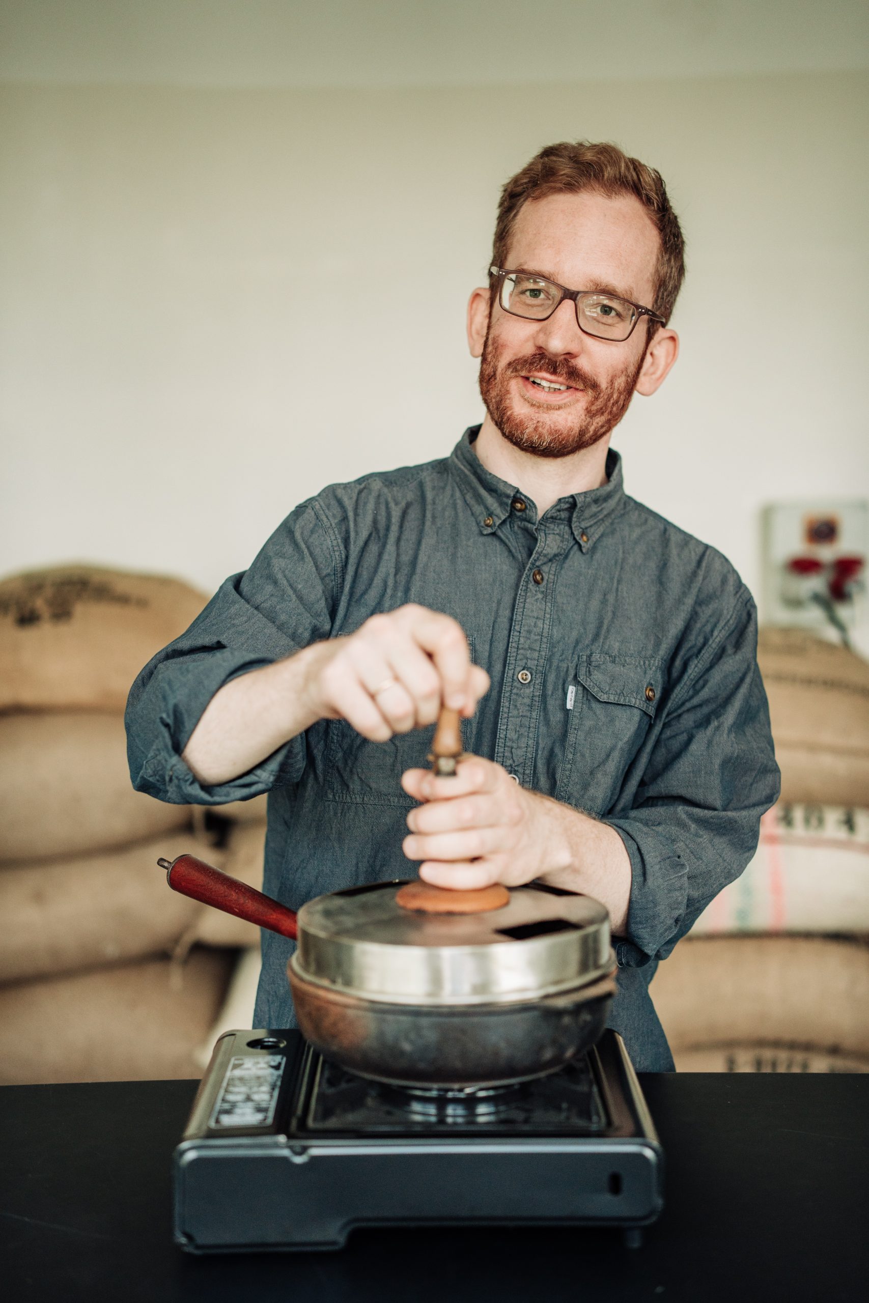 Nasz pierwszy setup do palenia kawy powstał w oparciu o żeliwną patelnię. Do szklanej pokrywy dorobiliśmy korbę napędzającą trzy ramiona, stale wprawiające kawę w ruch. Patelnię rozgrzewaliśmy na palniku gazowym, wsypywaliśmy zieloną kawę i przez kwadrans kręciliśmy korbą, tak żeby ziarna były w ciągłym ruchu. Na koniec zdejmowaliśmy patelnię z gazu, ziarna wsypywaliśmy na duże sito i chłodziliśmy na wietrze.