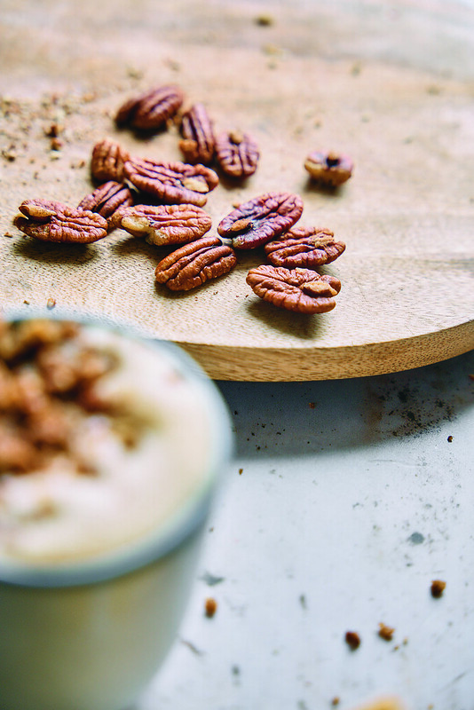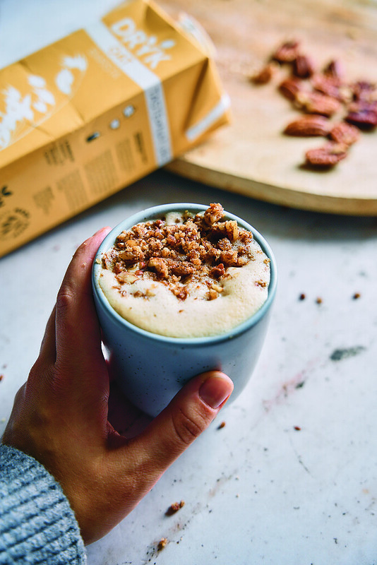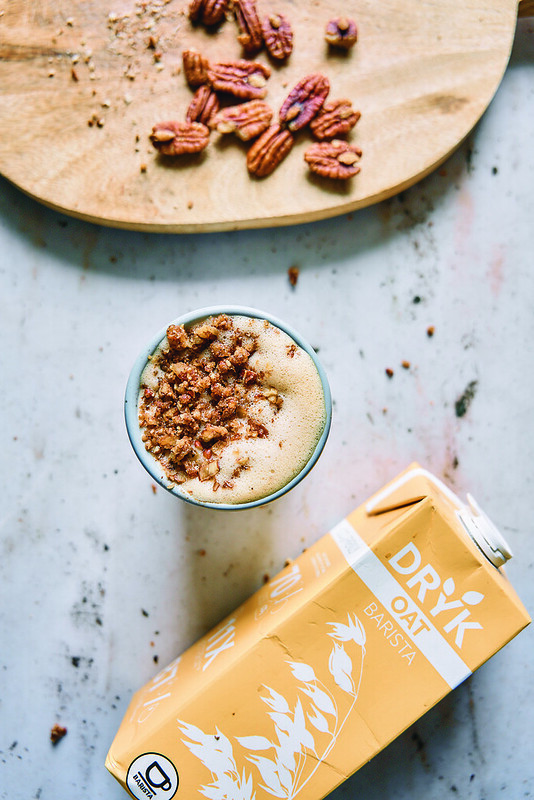 - W osobnym naczyniu połącz mleko owsiane z syropem pekanowym.
