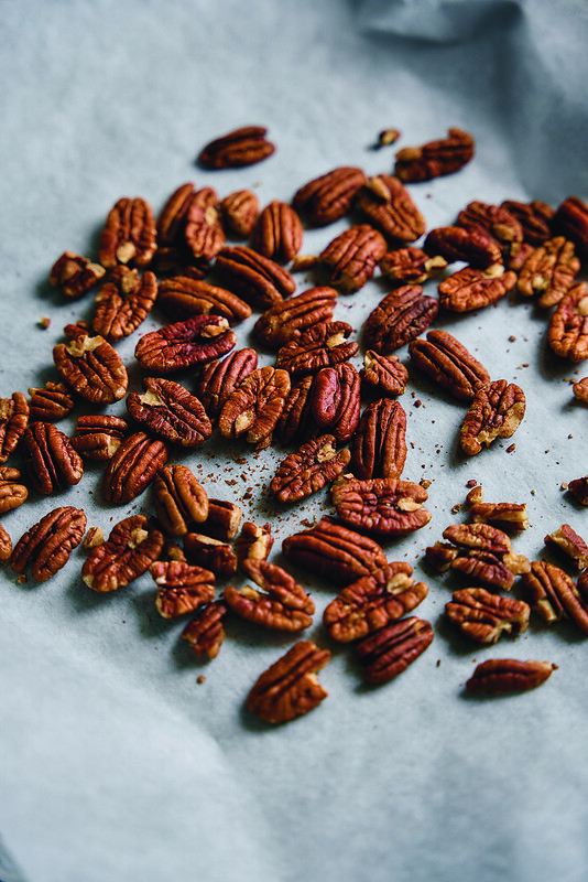 - Rozsyp orzechy pekan na blasze wyłożonej papierem do pieczenia.
