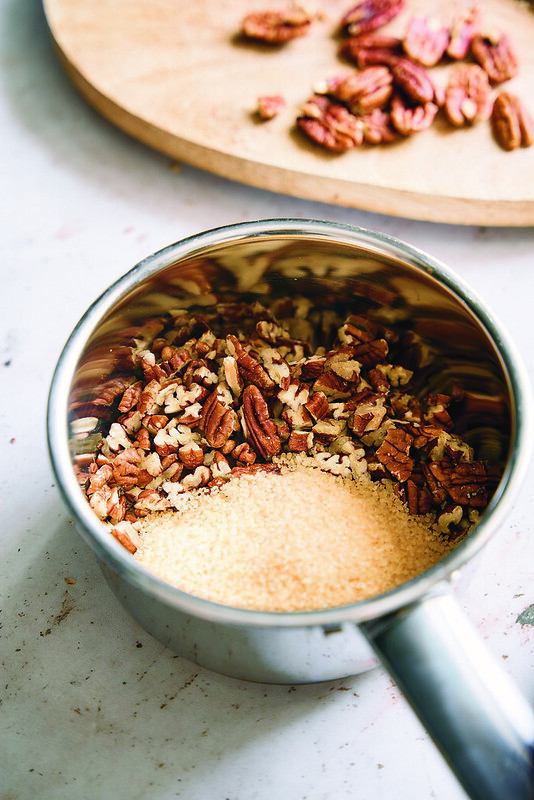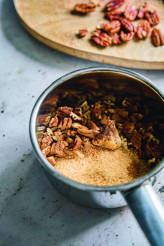 - W rondelku połącz orzechy pekan, wodę, cynamon, masło i brązowy cukier.