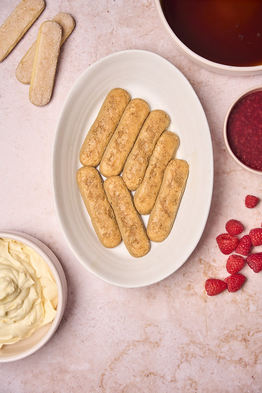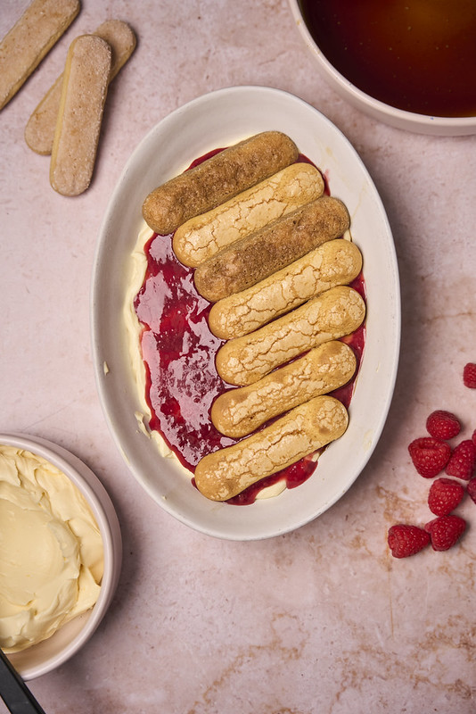 Kawę wymieszaj z likierem kawowym. Zanurzaj w niej biszkopty i układaj je w naczyniu. Na biszkopty nałóż warstwę mascarpone i konfitury malinowej. Powtórz nakładanie warstwy biszkoptów i mascarpone. Na koniec ułóż na wierzchu maliny i posyp pistacjami. Schłodź przez przynajmniej 5 godzin.