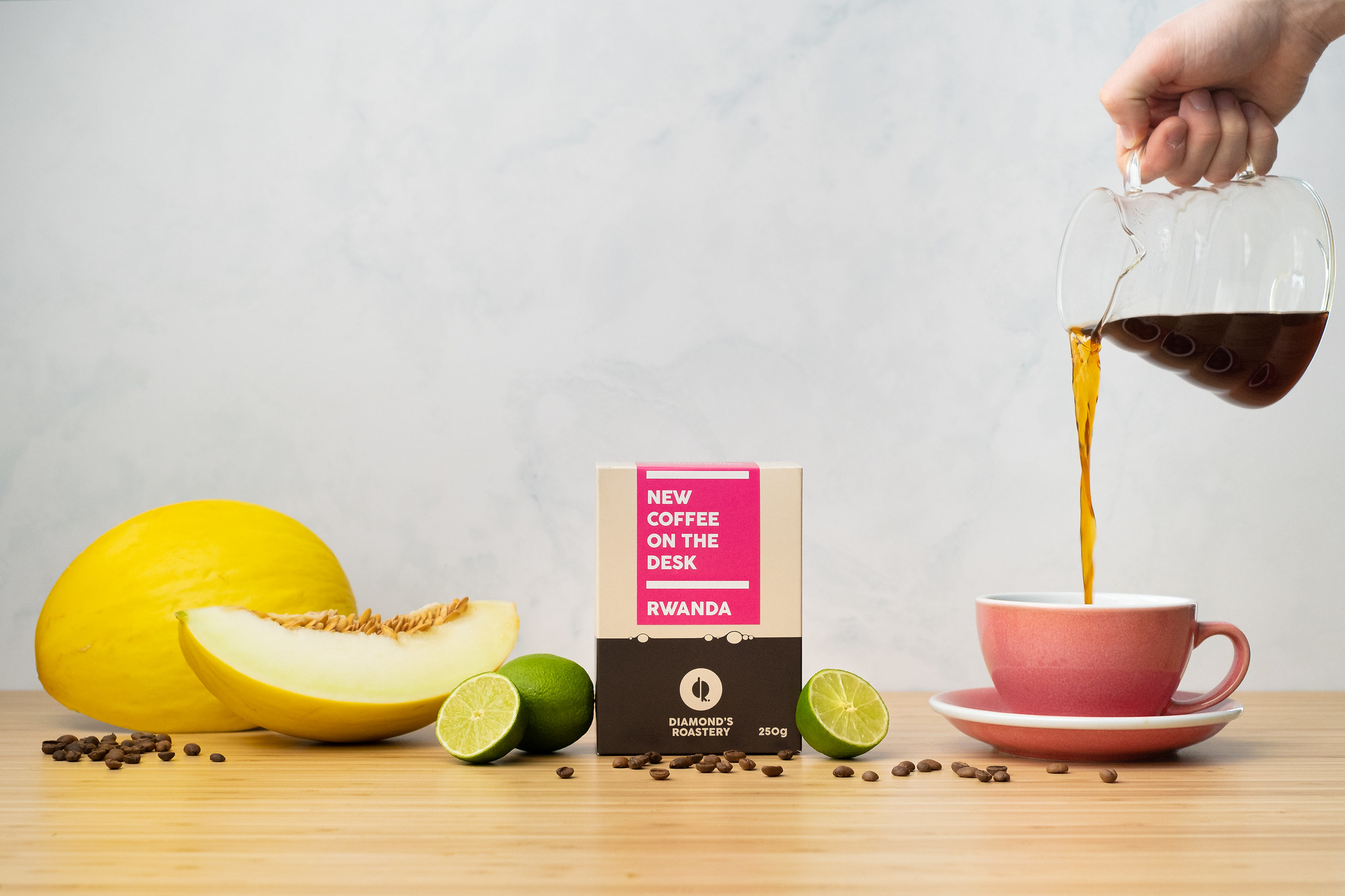 Diamond’s Roastery zawsze szykuje jakieś etykiety z zabawną, podtekstową adnotacją. Nie inaczej jest tym razem i na pudełku widnieje wielki napis „New coffee od the desk”, puszczając oczko do coffeedeskowych klientów.