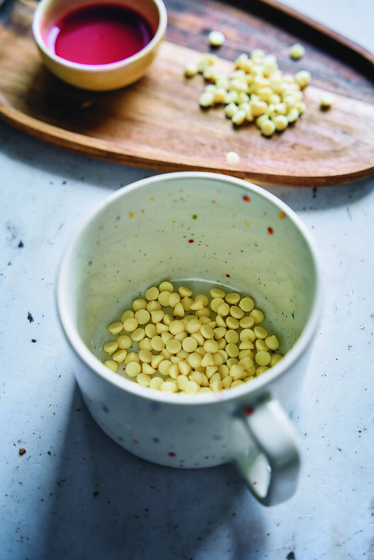 - Wlej syrop malinowy do kubka, dodaj mleko z białą czekoladą i espresso.
