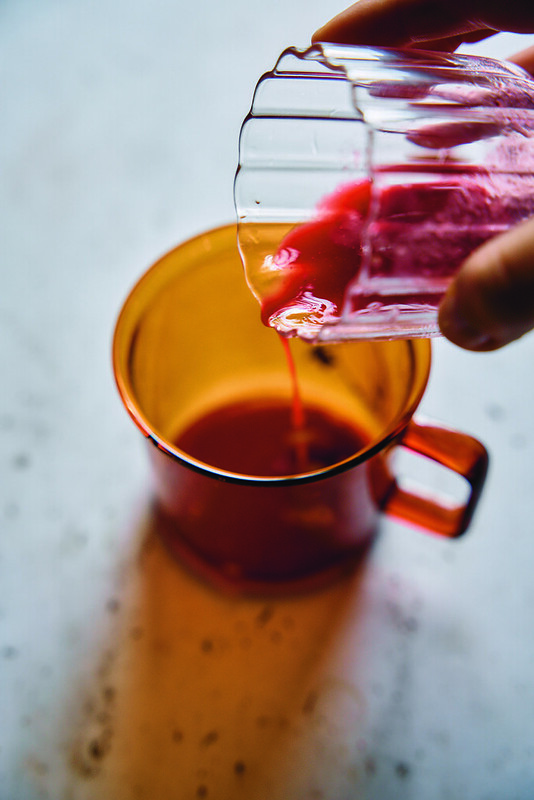 - Zdejmij z ognia i ostudź. Przecedź syrop przez sitko o drobnych oczkach, aby usunąćpestki.