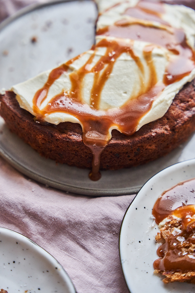 Kremem smarujemy wierzch gotowego, przestudzonego ciasta. Podajemy z solidną porcją karmelu kawowego.