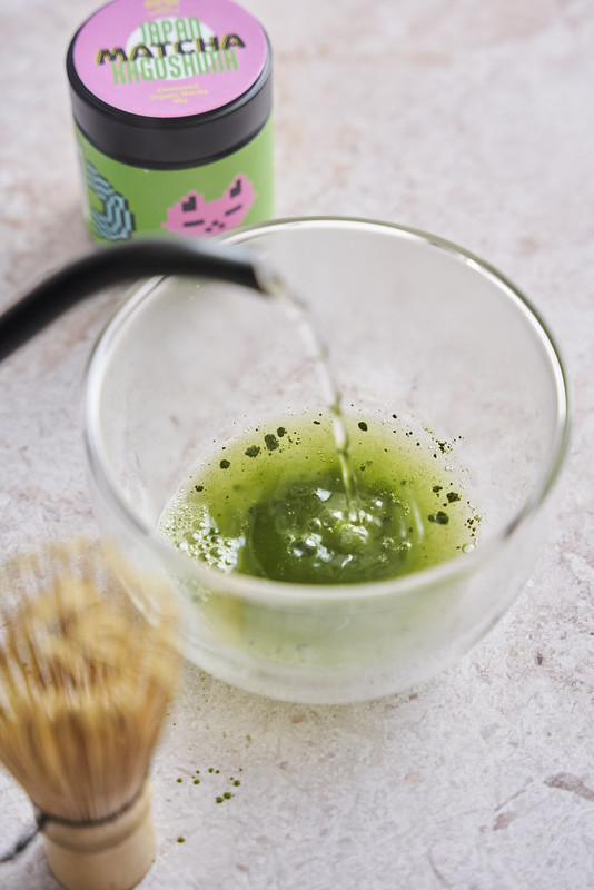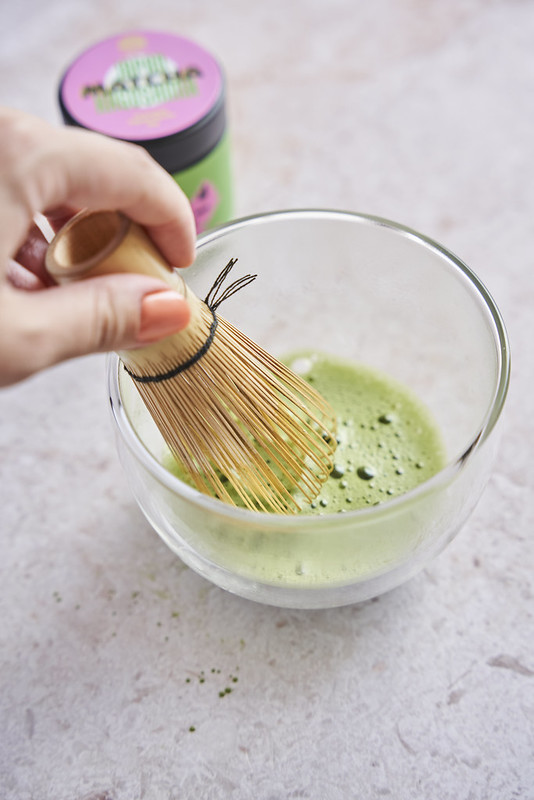 2. Matchę umieść w czarce/kubeczku, dodaj wodę o temperaturze 75-80 stopni i energicznie wymieszaj chasenem lub ręcznym spieniaczem do mleka.