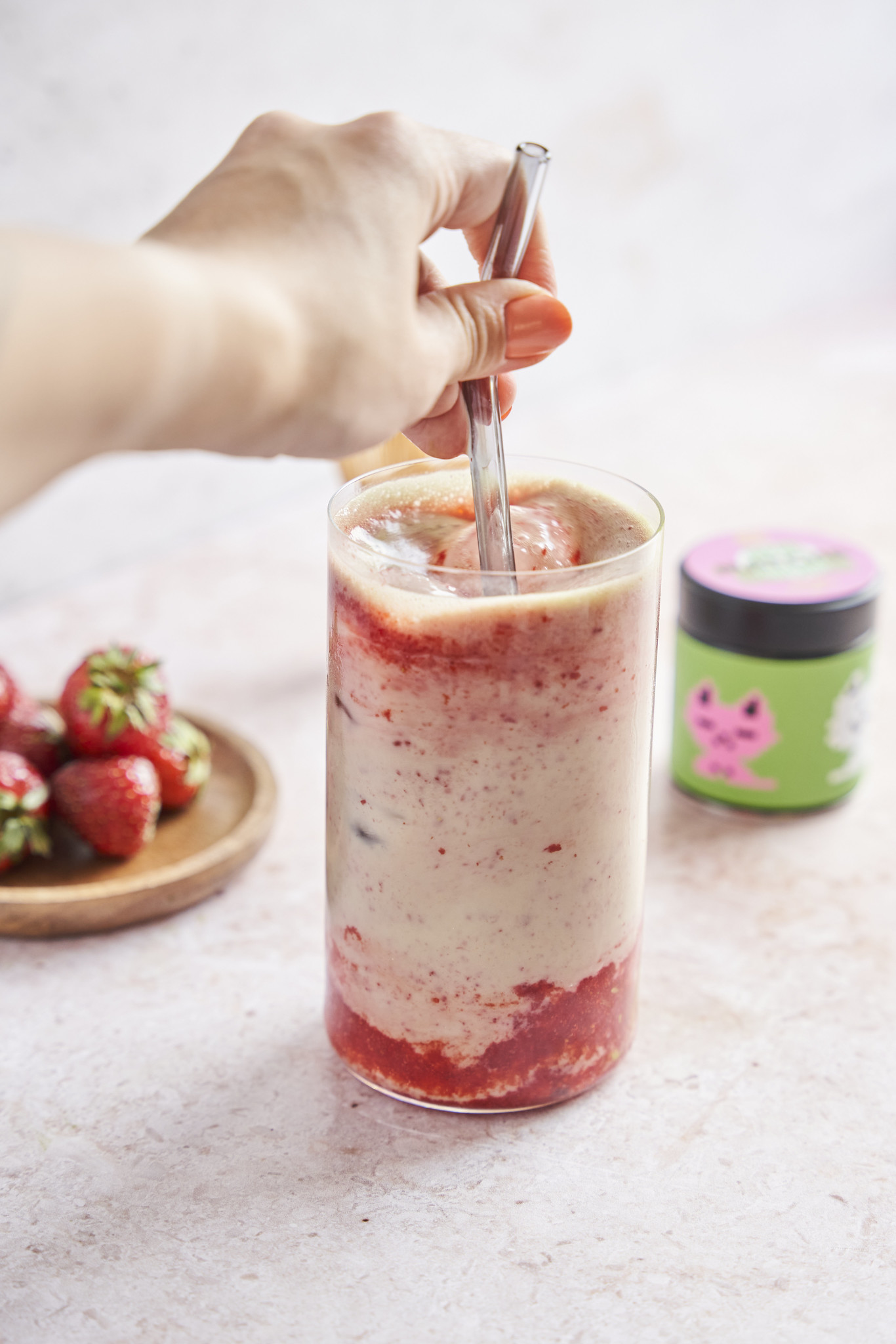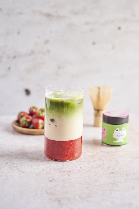 3. Dodaj warstwę truskawkowego puree na dno szklanki. Dodaj lód, a następnie wlej mleko, aby utworzyło drugą warstwę nad truskawkowym puree. Na koniec delikatnie wlej warstwę matchy na wierzch, aby utworzyć ostatnią warstwę.