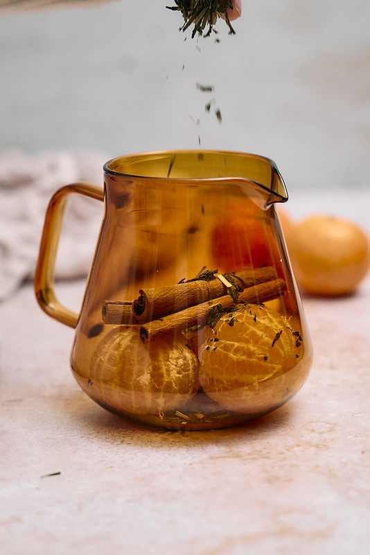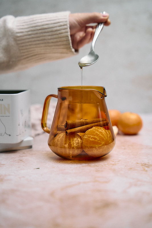 Włóż herbatę, mandarynki i laskę cynamonu i łyżeczkę miodu do czajniczka lub zaparzacza. Zalej herbatę wodą o temperaturzee ok.75-85°C (idealna dla zielonej herbaty). Parz przez 2-3 minuty.
