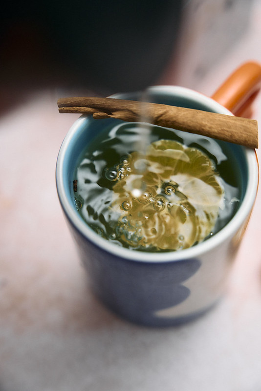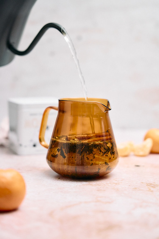 Włóż herbatę, mandarynki i laskę cynamonu i łyżeczkę miodu do czajniczka lub zaparzacza. Zalej herbatę wodą o temperaturzee ok.75-85°C (idealna dla zielonej herbaty). Parz przez 2-3 minuty.