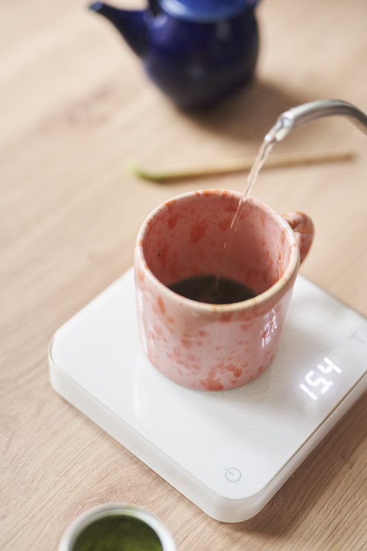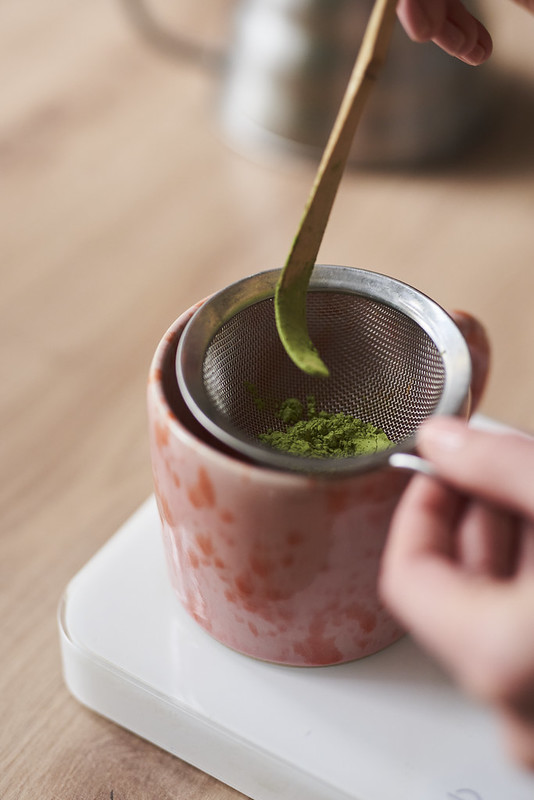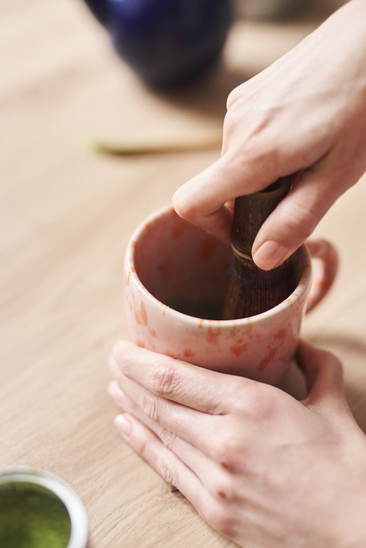 - Matchę i wodę umieszczamy w ulubionej czarce. Chasenem mieszamy do momentu dokładnego połączenia się składników i delikatnego spienienia.