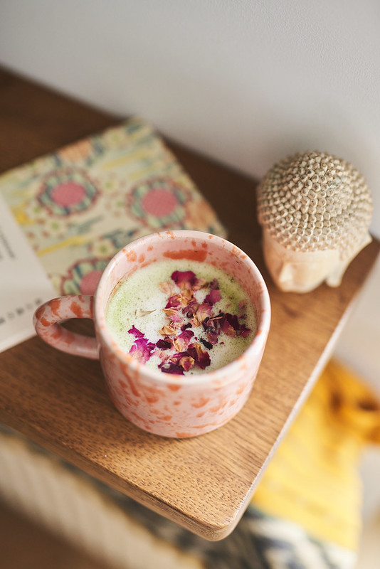 - Matchę energicznie mieszamy z wodą za pomocą chasena. Dodajemy syrop różany oraz spienione mleko. Wierzch posypujemy płatkami róży.