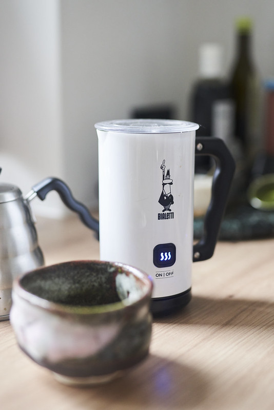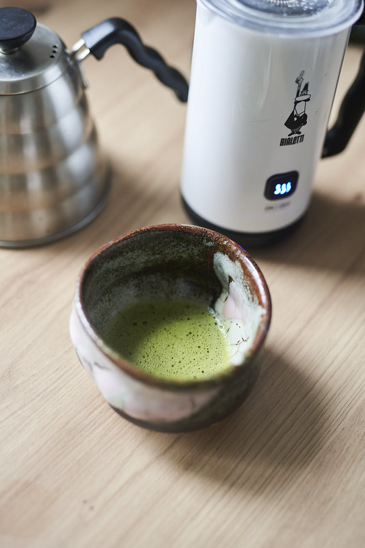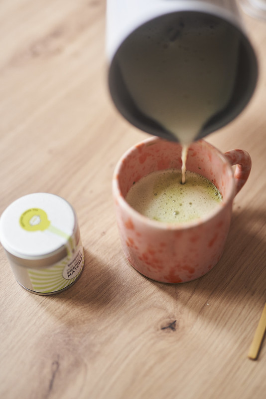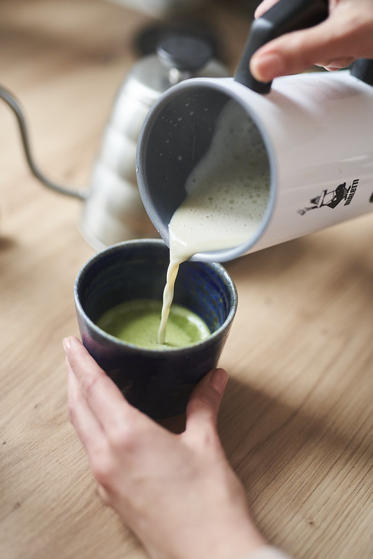 - Matchę zalewamy ciepłą wodą i przez ok. 20 sekund mieszamy chasenem. Dodajemy roztopioną czekoladę i spienione mleko, mieszamy.